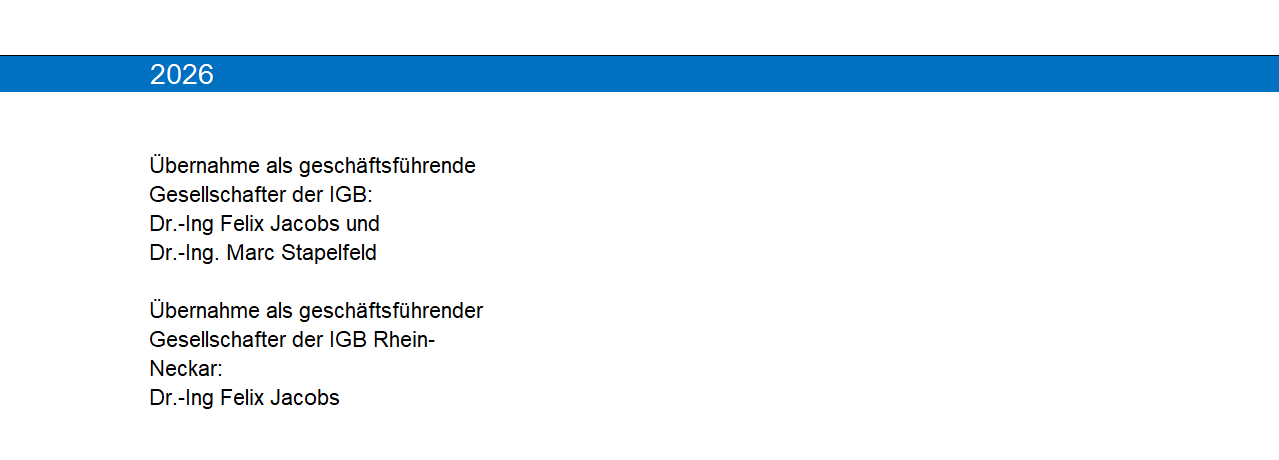 Die Herren Nils-Christian Lund und Jörg Franke werden der IGB ab 01.01.2026 als Berater weiterhin zur Verfügung stehen. Felix Jacobs und Marc Stapelfeldt sind seit Jahren Mitglieder der Geschäftsleitung und sind entsprechend gut auf die Geschäftsführungsaufgaben vorbereitet.